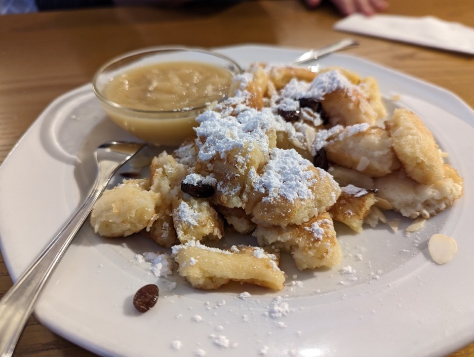 Nous avons mangé des délicieux Spätzle avec du fromage et des oignons. Et en dessert un Kaiserschmarr (pâte à crêpe allégée par les blancs montés en neige avec une compote de pommes).
