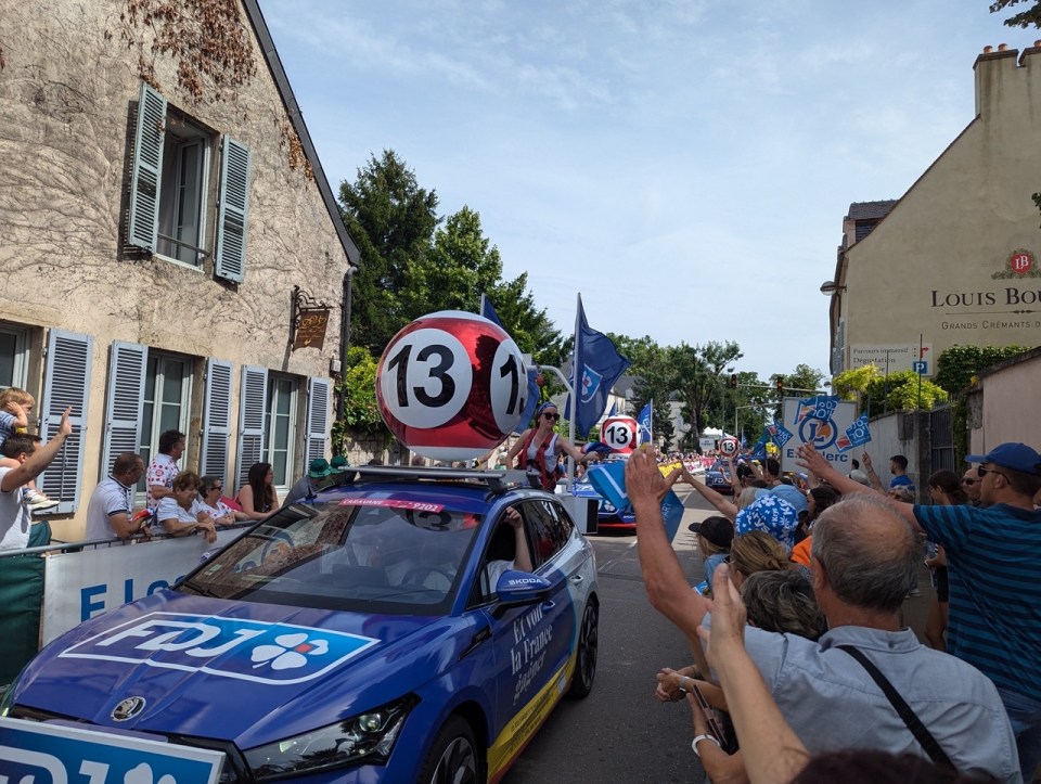 La caravane crée une atmosphère de fête avant le passage des cyclistes. Cette ambiance joyeuse et dynamique contribue à l’enthousiasme général et à l’attente excitée des spectateurs pour les coureurs.