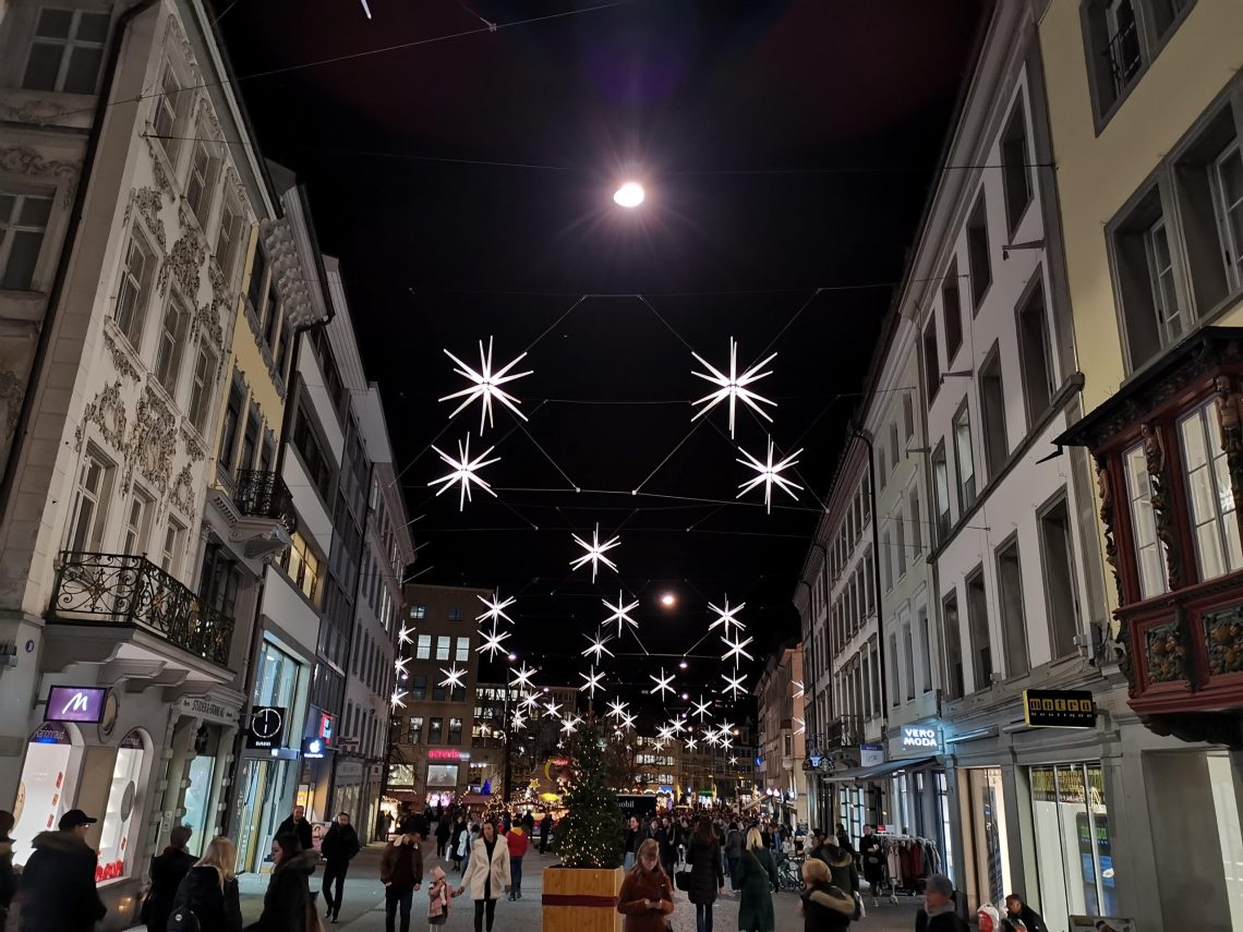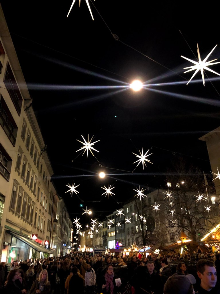 Ca y est! Retour dans la magie de Noël avec le marché de Noël de Saint Gall. Petit mais très joli avec ses décorations étoilées.