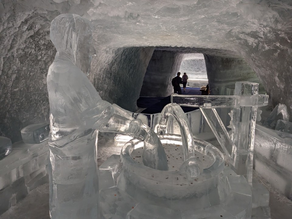 Dans le palais de glace, vous allez découvrir des sculptures de glace spectaculaires et des tunnels gelés taillés dans le glacier. Cela nous a rappelé le Jungfraujoch, où il y avait également un palais de glace.