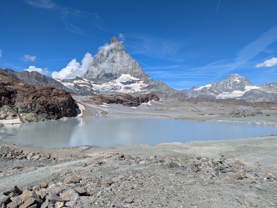 Lors du retour à Zermatt, nous avons fait un arrêt à la station de Trockener Steg. Nous avons ensuite marché jusqu’au lac avec une vue incroyable sur le dos du Cervin. Nous avions l’impression d’être sur une autre planète tellement c’était surprenant et beau à la fois.