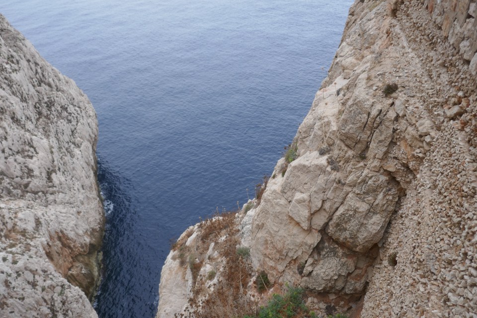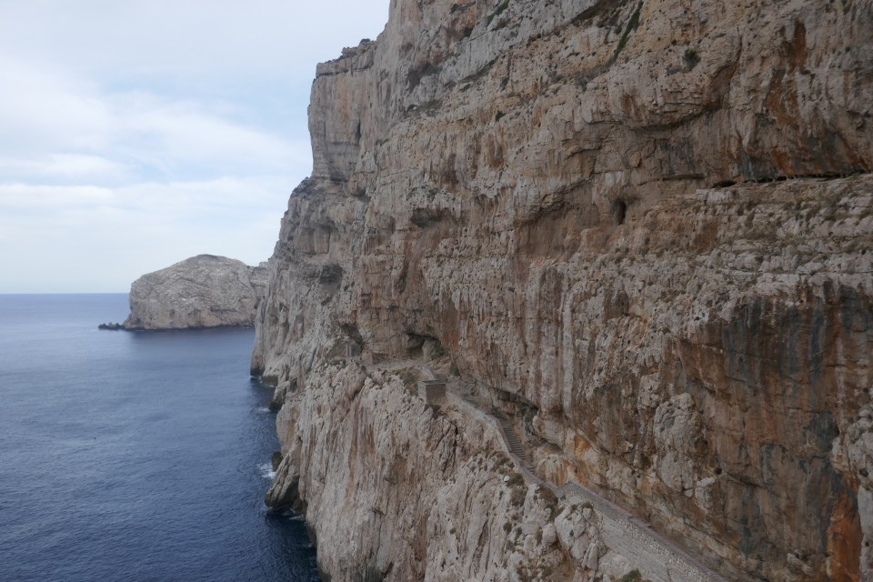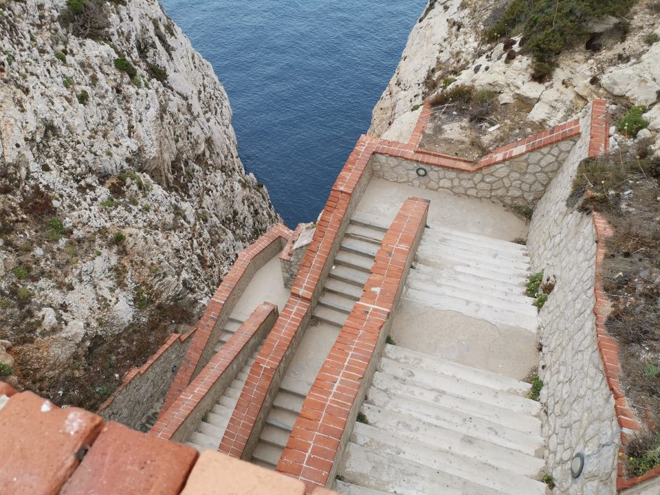On peut accéder aux grottes de Neptune soit à pieds, en descendant 650 marches ou y aller en bateau à partir d’Alghero. Et parce qu’on est des fous, on décide d’y accéder à pieds. Donc bien sur pour éviter le monde, il vaut mieux y aller tôt. La première descente est à 9h (il y en a toutes les heures). Arrivés à 8h30, 7 places de parking…on est troisième! Petite déception je pensais bien qu’on serait les premiers mais il faut croire qu’il y a plus fou!
