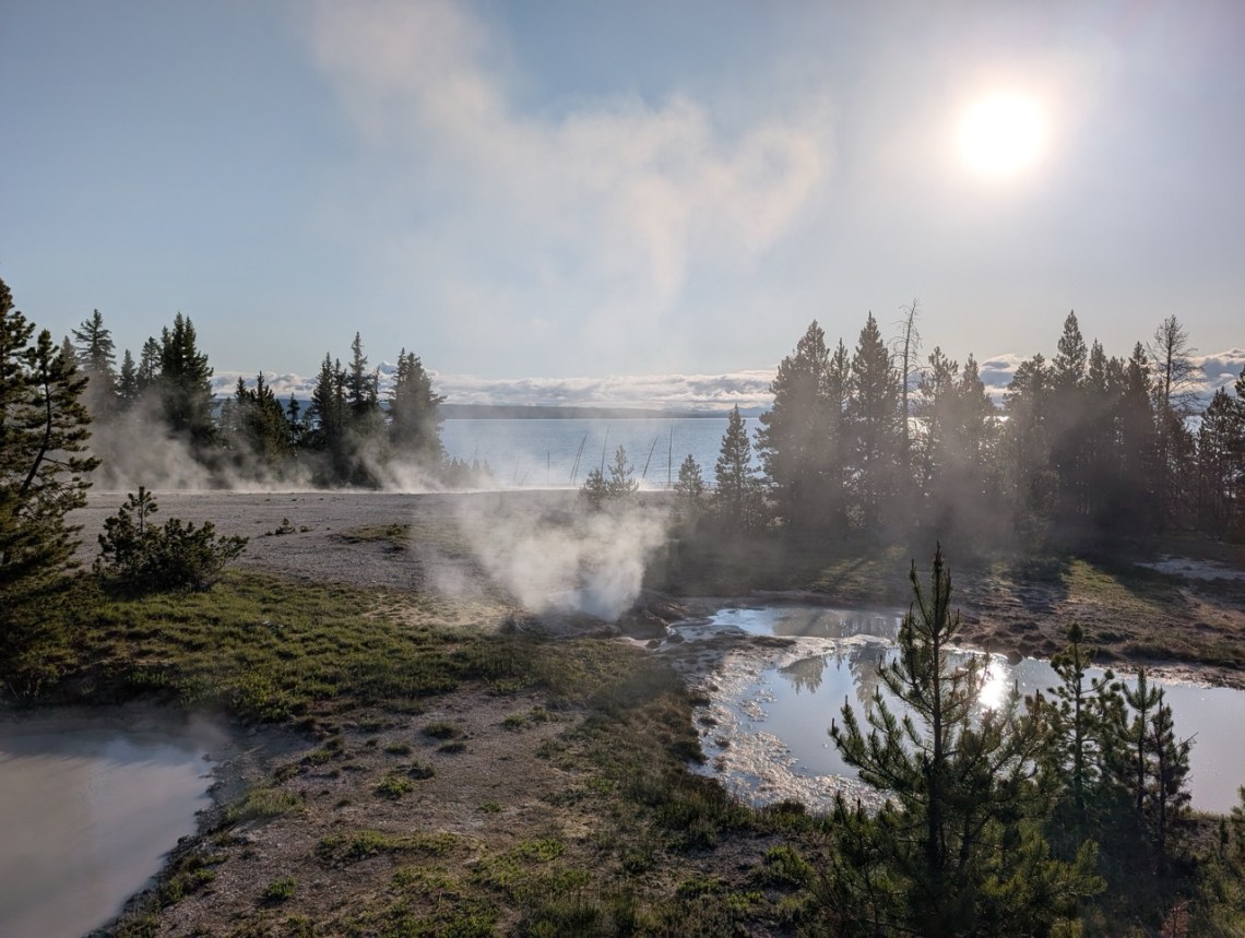 Après avoir pu visiter Yellowstone en 4 jours, nous avons prolongé le road trip avec la visite du Grand Teton National Park. Mais avant cela nous avons fait une dernière promenade au lever du soleil à West Thumb. Cela nous a permis de voir encore des geysers autour du lac de Yellowstone.
